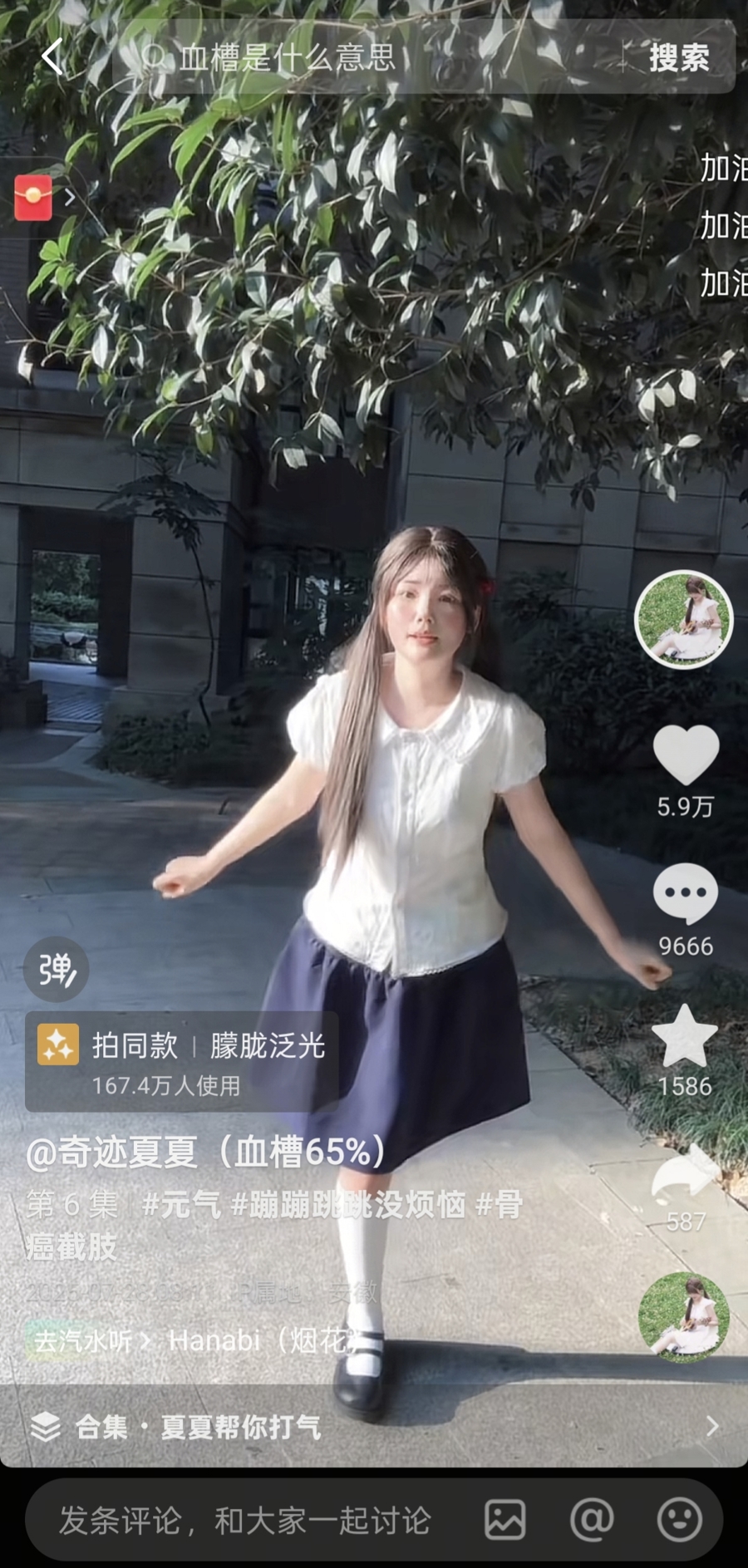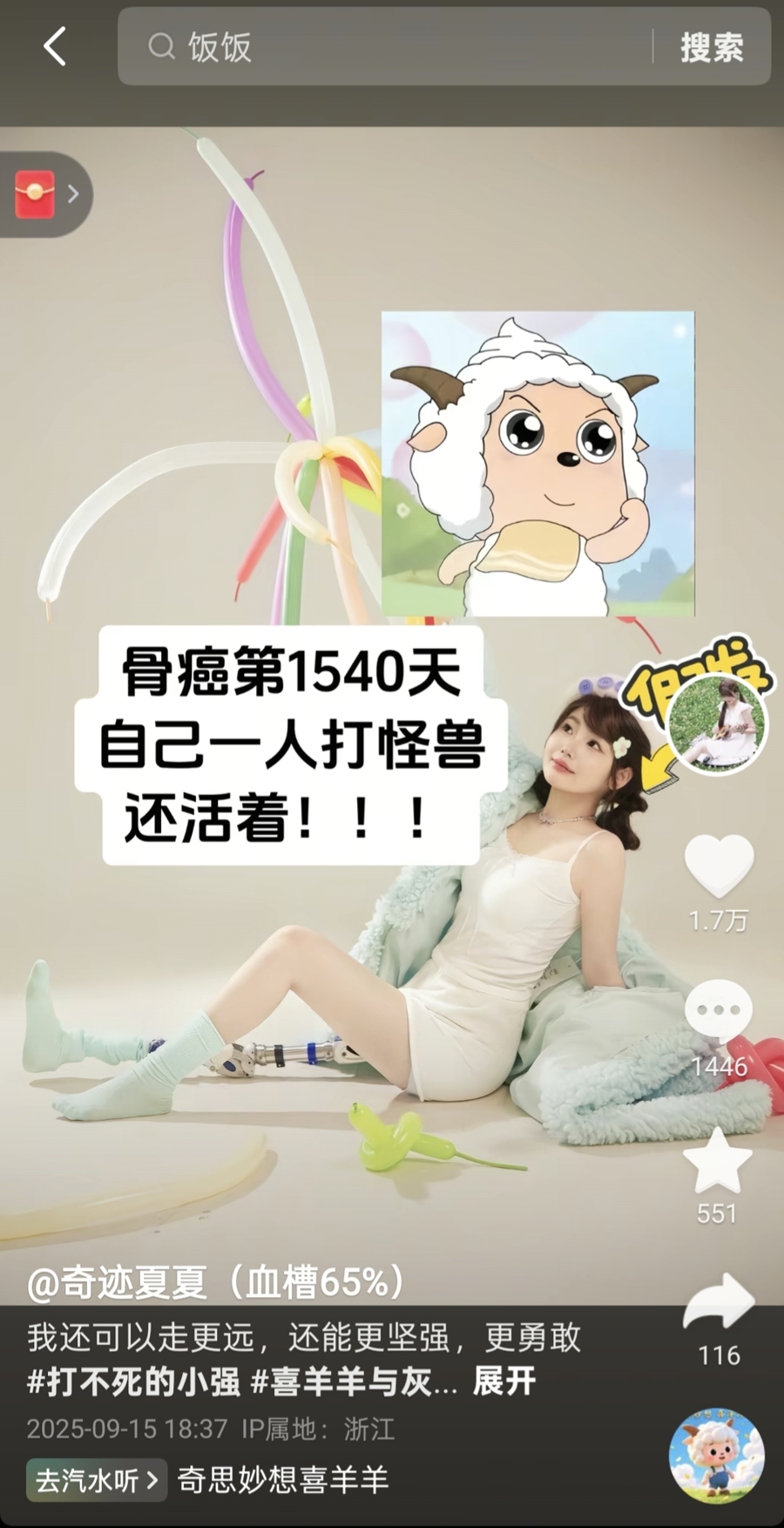 2022年,她开始尝试拍短视频。长期化疗让她格外虚弱,拍视频本身就是一种消耗,所以更新时间从不固定,有时几天一更,有时一个月才更一条。但她不刻意包装自己:状态好的时候,会用一条腿在镜头前蹦蹦跳跳,让大家直观看到自己的身体状态;情绪低落的时候,就直白地说“今天有点emo”,然后暂停更新。